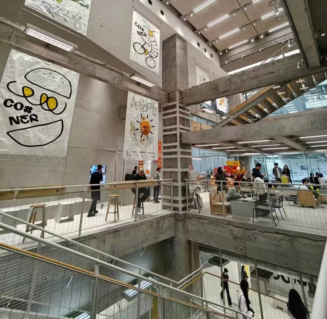 COSMO成都全新創(chuàng)意社區(qū)食堂成功開(kāi)放,水泥工業(yè)風(fēng)加上暖色桌椅相結(jié)合,還有可愛(ài)的簡(jiǎn)筆畫(huà)呼應(yīng),反差非常吸睛。干凈簡(jiǎn)潔的包豪斯風(fēng)格高級(jí)感拉滿。用美食社交理念打造出青年的食堂,主打“碰頭吃飯,食為了玩”。