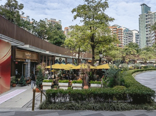 ◎廣粵天地整體為圓形布局,環(huán)繞于街心花園與步道,內(nèi)環(huán)是商業(yè)空間,外環(huán)是高檔社區(qū)。這是公園?還是住宅區(qū)?還是商場?