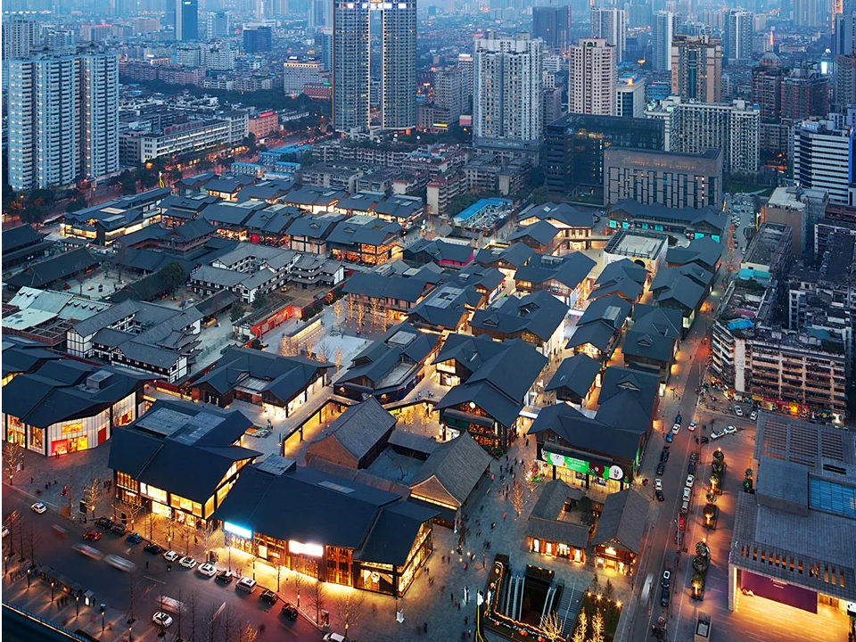正如隈研吾所言:“在地性不是對傳統(tǒng)的復制,而是讓建筑成為土地呼吸的器官”。成都遠洋太古里不僅完整保留了大慈寺片區(qū)6條歷史街巷(如筆帖式街、惜字塔巷等),還修復了廣東會館、欣廬等6座川西古建筑,通過“修舊如舊”手法重現(xiàn)“解玉溪”水系景觀,形成“一寺一城”的時空對話。建筑外立面采用川西青瓦坡屋頂與現(xiàn)代玻璃幕墻結(jié)合,檐口高度與街道寬度比例嚴格控制在1:1,營造“街巷有度”的步行體驗。